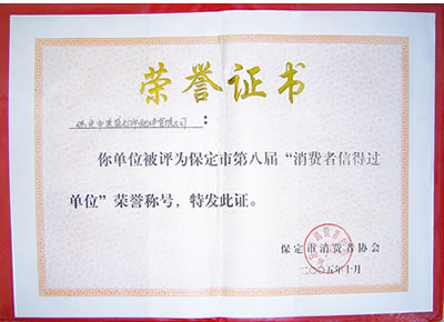 保定市第八屆消費者協(xié)會年終會議,(中美合資)保定萊盛打印機配件有限公司以優(yōu)質的產(chǎn)品,良好的信譽,完善的服務從眾多的商家中脫穎而出,被評為保定市“第八屆消費者信得過單位”,并由保定市消費者協(xié)會頒發(fā)了榮譽證書及銅牌。